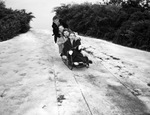Sledding down a hillside are (front to back) Ann Leonard, Bee Wright, J. H. Gaines Junior and Jimmy Sullivan. The four are shown sharing a sled and riding down the hillside together. Ann has her mouth agape in a smile while the others also laugh and grin. Ann holds the reins of the front of the sled close to her chest. On either side of the hill is a line of bushes and trees.