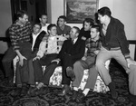 Coach Dutch Meyer, the head coach of the Texas Christian University football team is visiting with high school seniors. The seniors are some of the top players on the Wichita Falls Coyotes and the Odessa Bronchos. Seated on a couch left to right, are Dick Lowe, Bobby Moorman, Hayden Fry, Coach Meyer, Joe Dean Tidwell, and Pat Evitt. Behind the couch are Clinton Hill, Billy Moorman, and Bobby Rogers. Lowe, Tidwell, and Rogers are from Wichita Falls and the others are from Odessa. The teams faced off in the State Quarterfinals in December. The Odessa Bronchos were victorious and went on the become 1946 Texas State Champions.