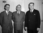(From left) Harold W. Lowrey, Denver, Colorado; E. Rogers, Okhlahoma City, Oklahoma; and Walter Williams, Okhlahoma City, Oklahoma. The trio of men are shown standing in front of a pair of doors covered by curtains. Each of them are wearing suits, Rogers's and Williams's shuits are double-breasted, and patterned neck ties. They stand side by side and appear to be smiling for the camera.