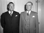 Walter A. Richards (left), Columbus, Georgia and J. Fred Cleveland. The duo duo are shown standing in front of a pair of doors covered by curtains. Each of them are wearing suits and a pair of eyeglasses. Richards has his hands behind his back and smiles at the camera while Cleveland looks off to the side and keeps his hands down his side.