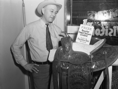 Midland, Texas is holding their sixth annual rodeo. One of the boosters responsible for the rodeo's growth is Homer Epley. Mr. Epley is the secretary of Midland Fair Incorporation. He is shown with one of the prize saddles for the Regular Cowgirl Sponsor's Contest. The saddle is being donated by the Blackstone Hotel in Fort Worth, Texas. Mr. Epley is wearing a hat, button-up shirt, necktie, and trousers.