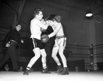 Boxers in the Fort Worth, Texas area are preparing for the Golden Gloves District Tournament on January 30, 1946. Competing in a practice round at the Recreation Building, left to right, are lightweights Kenneth Bellmard and Jackie Lawrence. The are shown in the middle of a furious battle in the third round. Lawrence went on to win the close brawl on points.