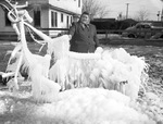 Winter Scenes. Mrs. Margaret McVeigh shown with ice formation on broken pipe. Mrs. Mcveigh is standing behind the ice formation made around the broke pipe and grinning. She is wearing a buttoned up coat and a scarve tied around her head. She is also wearing a pair of eyeglasses. She has her hand reached out to hold a part of the icicle.