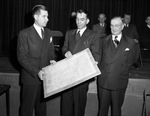 Fort Worth Presbyterian churches. Reverend Winston Bryant (center) of John Knox Presbyterian Church, holding a list of the churches' charter members. At left is Reverend Robert F. Jones of First Presbyterian Church, who is helping Reverend Bryant hold up the list,and Reverend James F. Hardie of Saint Stephen Presbyterian Church, looking on. Each of them are dressed in double-breasted, dark suits with Reverend Hardie also wearing a pair of glasses. The charter member list is large and attached to a sturdier backing. Behind the trio is a small stage and a few other men seated in a row of chairs.
