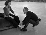 Miss Shirley Bothe and Bob Echols Junior, ice skating. Mr. Echols is shown knelt down and tying Miss Bother's ice skating boots as she sits on the edge of a sled. Both are smiling and laugh as Mr. Echols looks up at her. Miss Bothe is wearing a pair of wide-legged trousers with a striped vest on top of a long-sleeve shirt and Mr. Echols is wearing a sweater and trousers. Behind them, the frozen pond can be seen.