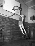Sam Adams is a forward on the Amon Carter Riverside High School basketball team. He is preparing for the Eagles' upcoming game against Paschal, Wednesday night. Adams is shown leaping into the air, and rolling the basketball off his fingertips for an easy layup. He is dressed in his number 5 basketball uniform.
