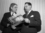 Lamar Fleming Junior (left) of Houston, Texas and W. H. Wright. The two are shown standing next to each other as they discuss plans for aid to China at a luncheon at Hotel Texas. Mr. Wright is holding up a pamphlet that reads "Straight Talk on China" across the cover of it. Both men are wearing dark, double-breasted suits and Mr. Fleming Junior is also wearing a pair of eyeglasses.