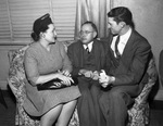 Doctor Earl R. Carlson (center), authority on cerebral palsy and author of "Born That Way", with Mrs. August Kreuger of Meridian, Texas and Representative-elect Pyle. The trio is shown sharing a floral couch as they chat with each other. The men are wearing suits with patterned neck ties and Mrs. Kreuger is wearing a striped dress with a netted hat. Mrs. Kreuger is also holding a purse on her lap and Mr. Carlson is wearing a pair of eyeglasses. Behind them is a window and a wall.