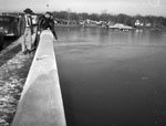 Doctor B. W. Nies suicide at Lake Worth. Fort Worth City Motorcycle Officer J. M. Floyd (pointing) and his partner, W. R. Shockley, look over a rail of a bridge to where Doctor Nies committed suicide. As Officer Floyd points to the lake, Shockley looks over the rail in the center of the lake to look at the spot where the body was discovered. Both are dressed in leather jackets and officer's hats. Next to them is an unnamed man dressed in a jacket, gloves, and a hat, who is also looking on. Behind the rail, a couple of cars can be seen parked along the side. Further in the background, a boat can be seen out on the lake.