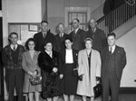 Armour and Company is celebrating employees with 25 years of service in the meat packing industry. Being presented with silver buttons, left to right, on the front row are J. A. Wade, Mrs. Frances Bennett, Mrs. Nannie Teakell, Mrs. Smyra Dundar, Mrs. Emma Helton, and Paul Foyt. On the back row are Willie May, K. D. Bell, Guy Hukel, and Charles Gillaspy.