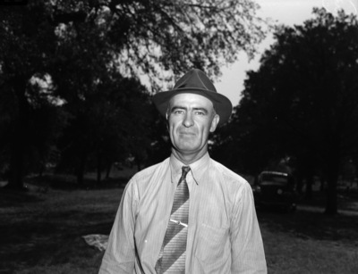 The Steiner Valley Ranch is holding their annual field day near Whitney, Texas. The Ranch is owned by Burleson and Johns and managed by Albert Kyle. Attending the field day is J. G. Golightly, a Hico Hereford breeder. Mr. Golightly won first prize in the livestock judging contest. He is standing under a tree dressed in a hat, button-up shirt, and a necktie.