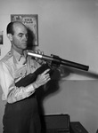 William F. Tucker. Mr. Tucker is shown inspecting a firearm as he unloads it. He is wearing a long-sleeve, pocked shirt and a poair of trousers. Below him are two suitcases, with one being open and a wall with a poster hanging on it.