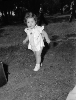 The Steiner Valley Ranch is holding their annual field day near Whitney, Texas. The Ranch is owned by Burleson and Johns and managed by Albert Kyle. Enjoying the field day and winning the hearts of all present is Kay Cowan. She is the fifteen month old daughter of Mr. and Mrs. Bobbie Cowan of Hillsboro, Texas, and the granddaughter of Mr. and Mrs. Albert Kyle. Kay is waling around the ranch, wearing a dress.