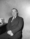 James H. Smelcer, former resident of Saint Louis, Missouri. Mr. Smelcer is shown sitting in a chair next to a desk that has a small box and book placed on top of it. Mr. Smelcer is wearing a double breasted suit and a patterned tie. He also has his hands crossed in his lap and appears to be looking to his left.