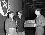 Demobilization of 27th Battalion of the Texas State Guard. Major Orson E. Paxton (right) presenting gifts to Lieutenant Colonel Marshall H. Kennady and Lieutenant Colonel C. G. Fox. Major Paxton is shown presenting a fly rod and fishing tackle to Kennady and a wrist watch to Fox. The trio of men are dressed in military uniform and Fox is also wearing a pair of eyeglasses. Paxton holds up a box filled with various fishing tackles and appears to be handing it over to Kennady, who looks on happily. Fox holds up his watch, who's case is open.