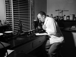 The Veterans Administration Clinic in Fort Worth, Texas, is moving its headquarters from the Majestic Building to the Ponton Clinic Building. Pictured in the expansion laboratory is technician Lawrence L. Unkart. He is looking in a microscope, studying a malaria-smear. Mr. Unkart is dressed in a collared shirt, trousers, and a lab coat.