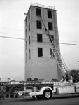 The city of Fort Worth, Texas, is holding a Red Cross First Aid campaign. Under the direction of Chief Ernest Tunnnell, the Fort Worth Fire Department is offering 20 classes for members. The Fire Department is demonstrating methods of ladder rescue work. A firefighter is shown climbing a ladder to gain access to the sixth floor of a building. The firetruck is parked outside the building.