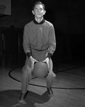 Luther Scarborough is the center on the Polytechnic High School basketball team. He is shown practicing his tip-off leap in preparation for the Parrots upcoming game against Paschal High School. The match-up will be the first basketball game held at the Will Rogers Memorial Coliseum. Scarborough is dressed in a warm-up suit.