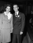 Mr. and Mrs. Mike George. The bride is the former Miss Geraldine Belle Kennedy. The newly married couple is shown hand in hand and grinning excitedly. Mr. George is wearing a pinstriped, double breasted suit and Mrs. George is wearing a gabardine suit with matching flower hat and a gardenia corsage. Behind them, some of the chapel can be seen. Mrs. George is the daughter of Mr. and Mrs. R. R. Kennedy and Mr. George is son of Mr. and Mrs. Nick George.