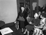 Mrs. W. R. Ash standing, pleading the case of the Humane Society. Mrs. Ash is shown talking to the judge, that is off camera, and asking that they may delay the society's eviction from the courthouse. She is wearing a dark, thick coat with a pair of gloves and a purse. She is also wearing a hat. Around her are other seated women who look on at her speak. Behind her is an open doorway with a few men peeking in and looking at the proceedings.
