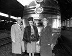 A group of Texas cattlemen, stock show officials, and their wives are representing Texas at the National Western Stock Show in Denver, Colorado. Awaiting their train at the Texas and Pacific Railway stations, left to right, are Mr. and Mrs. W. R. Watt and George B. McElroy. Mr. Watt is dressed in a cowboy hat, suit, and a coat. Mrs. Watt is wearing a hat, dress, fur coat, and gloves. Mr. McElroy is dressed in a hat, suit, and a coat. The group is shown standing on the tracks in front of a stopped train.