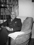 S. E. Bostwick, retired salesman and mayor of Forest Hill Civic League. Mr. Bostwick is shown sitting on a floral patterned armchair adorned with doilies across the arms and the back of the chair. He is sitting with his legs crossed and appears to be smiling. He is wearing a pinstriped suit and has a birdcage set up next to him.