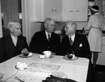 Left to right, A. A. Dunn, Doctor J. N. Thomas and Doctor W. B. McKnight. The three men are shown sitting at a table in the kitchen, enjoying a round of tea and coffee. The trio is celebrating Dr. Thomas's 90th birthday together. Each of them are wearing dark suits and neck ties. Dr. McKnight is also wearing a pair of glasses. Behind them, kitchen cupboards and an African-American woman can be seen near the sink.