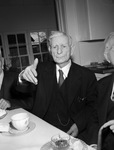 Doctor J. N. Thomas, 90. Doctor Thomas is shown sitting between his companions at a kitchen table with a tea cup set in front of him. He is pointing at the camera and wearing a dark suit. Behind him are kitchen cabinets and a doorway. He is celebrating his 90th birthday.