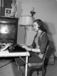 Miss Betty Claire Schmid, reporter of fashion magazine. Miss Schmid is shown sitting at a table typing out reports on a typewriter. She is wearing a mid-sleeve, striped dress and a beaded necklace. Next to her is a standing lamp and a wooden dresser. On top of the dresser is a statuette of the Virgin Mary and a framed picture of a woman. Miss Schmid is a former Star-Telegram reporter who now is college board fashion editor for Mademoiselle magazine.