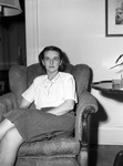 Mrs. Granville T. Walker. Mrs. Walker is shown sitting cross-legged in an armchair. She is wearing a dark skirt with a short-sleeve blouse tucked into it. Beside her is a small table with an ash tray and plant set on top if it. To her right is a standing lamp. She appears to be looking forward.