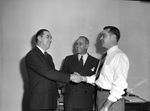 The Stanolind Oil and Gas Company recently announced a new division landman in the Fort Worth, Texas, office. Pictured left to right are George C. Mahaffy, Jack Meeks and Jack Malloy. Mr. Mahaffy is the new division landman. He is dressed in a double-breasted pinstripe suit. Mr. Meeks is the assistant division landman. He is wearing a double breasted suit. Mr. Malloy is the assistant to the division landman. He is wearing a button-up shirt, necktie, and trousers.