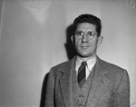 Gene Lambert is the head coach of the University of Arkansas basketball team. His Razorbacks are in Fort Worth, Texas to face the Texas Christian University Horned Frogs. Lambert has led his team to winning seasons in all four years as coach, and one appearance in the Final Four. Coach Lambert is shown standing against a wall, dressed in a three-piece tweed suit.