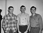 The University of Arkansas basketball team is in Fort Worth, Texas to face-off against the Texas Christian University Horned Frogs. The star Razorbacks, left to right, are Roxie Rankin, George Kok, and Robert Honea. Rankin, guard, is dressed in a plaid, button-up shirt and trousers. Kok, center, is the tallest player on the team at 6-10. He is dressed in a short-sleeve shirt tucked into trousers. Honea is wearing a button-up shirt tucked into trousers. The Razorbacks went on to win the game 54-39.