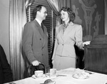 June Lockhart, movie startlet (right). Miss Lockhart is shown talking to an unnamed man dressed in a suit and glasses, Both of them stand near a dinner table that has beverages and plates unfinished food on it. Miss Lockhart is wearing a buttoned jacket and a skirt ensemble with a patterned blouse underneath the jacket. The duo appear to smiling as they talk. Behind them is a window with curtains pulled to the sides and wall with a mural on it. Miss Lockhart is currently touring Texas and plays the daughter of "Senator Claghorn" in the movie, "It's a Joke, Son".