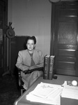 Cowan, Ruby (Mrs.); Desks; Clothing & dress; Purses; Chairs; Forms (Documents); Doors & doorways