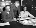 Bombay land improvement officers (from left) M. K. Shirole of India; D. O. Davis of Fort Worth, Texas; and M. S. V. Ramrao. Mr. Davis is shown standing between Mr. Shirole and Mr. Ramrao of India, who are seated at the table in front of them. The trio is looking over a large stack of pictures and writings dealing with the conservation in Texas. Each of them are wearing different suits and Mr. Davis is also wearing a pair of eyeglasses. Behind them is a multitude of file cabinets. The men appear focused on their work.