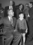 Constable O. M. (Jimmie) Myer with his son, Jimmie, in court room. Myer is shown seated in a chair with his small son standing next to him with his hand on Myer's leg. Myer is wearing a double-breasted suit with a patterned tie while his son wears a pair of shorts and a buttoned up shirt. The two listen on at the attorney's arguments in the court regarding Myer's aggravated assault charge. Behind the duo is a small crowd of men dressed in suits and talking to each other. Myer's got acquitted for the charge after 17 minutes of jurt deliberation.