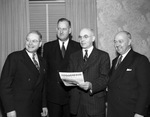 Presbyterians leaders. Left to right, Reverend Clyde Wilson of Wisconsin, Reverend Frank D. Travis of Denton, Reverend H. A. Dalzell of New York City and Glenn W. Moore of Los Angeles. The four men are shown standing together, smiling and looking to their rights. Each of them are dressed in dark, double-breasted suits, except for Reverend Dalzell who is dressed in a pinstriped suit. He is also holding a small newspaper that reads, "RESTORATION FUND NEWS", on the front of it. Behind them is a wall with a window and curtains. These men are the leaders of the Presbyterian Church's effort to raise &27,000,000 quota in the effort to restore churches, schools, and hospitals in war-devastated countries.