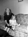 Mrs. Robert A. Geisler is shown posing with her three-year-old daughter, Linda Carol Geisler. Mrs Geisler was recently elected president of the Junior Woman's Shakespeare Club. She is also a critic for the literature section of the Junior Woman's Club. She is wearing a dark dress and a pearl necklace. Linda Carol is sitting on the couch beside her mother. She is wearing a dress with lace around the collar and a bow in her hair.