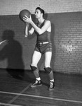 E. F. Parham is a star player on the Texas Wesleyan College (T. W. C.) basketball team. He is shown practicing for an upcoming game against Hardin-Simmons University. If Parham can reach 20 points Friday night, he will pass the 300 mark. He is dressed in a number 55 basketball uniform.