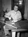 W. F. Gilliland in the workshop of the Lighthouse for the Blind. He is one of the blind workers employed by the organization. Mr. Gilliland is shown crafting a potato masher. He is dressed in a short-sleeve plaid shirt and trousers.