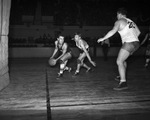 A high school basketball game between the Paschal Panthers and the North Side Steers (white jerseys) is being held at the Will Rogers Memorial Coliseum. Panther, Ernie Vossler (15) is underneath the basket, searching for a receiver as he sets to pass. Steer, Ray Lowe is moving into the lane to block the effort. Number 20 is standing in the paint. The Panthers went on to win the game 41-24.