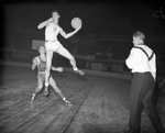 Douglas Higgins, player 3, (T. W. C.) is shown mid jump with the basketball in his left hand. Behind him is player number 33, Murray Leffingwell from Hardin Simmons leaps to make a pass during the Ram- Cowboy game.