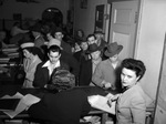 Billy D. Hawley (center) is standing at the counter to pay his poll tax of $1.75. Mr. Hawley is a military veteran. He fought in the Italian campaign and lost a leg after lying wounded for 24 hours on a battlefield. He is dressed in a collared shirt and a pinstripe suit.