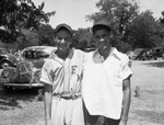 Rosen Heights beat the Red Rebels in the Junior Baseball Championship of Fort Worth, Texas. The 16-year-old class is the oldest class in the league sponsored by the Recreation Department. Two of the top players are, left to right, Bobby Huff and Tony Tatarevich. Huff is the pitcher, who took credit for both wins over the Rebels. He is dressed in a baseball uniform. Tatarevich plays shortstop for Rosen Heights. He is dressed in a baseball cap, collared shirt, and trousers. There are automobiles parked in the background.