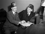 The Fort Worth Moslah Temple of the Shrine is being honored with a visit from the top ranking Shriner in the nation. Sitting at a desk, left to right, are Jerry Fite and George H. Rowe. Mr. Fite, of Fort Worth, Texas, is the potentate of the local temple. He is dressed in a fez and a three-piece suit. Mr. Rowe, of Buffalo, New York, is the imperial potentate and honored guest. He is a justice of the New York Supreme Court. He is wearing a fez and a dark, three-piece suit.