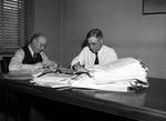 Fort Worth, Texas, Mayor Roscoe L. Carnrike (left) and City Secretary E. S. Birdsong are signing $2,000,000 worth of bonds. The bonds will be exchanged for cash that will improve airports, streets, parks, and recreation facilities. The bonds will also add new livestock buildings to the Will Rogers Memorial Grounds. The bonds were taken by the Fort Worth National Bank and associates last month. Mayor Carnrike is dressed in a striped collared shirt, necktie, and a vest. Secretary Birdsong is wearing a dress shirt and a necktie.