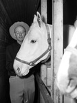 The Will Rogers Range Riders are traveling from West Texas to Austin, Texas. Pictured in the horse car of a train are John R. Wigging and "Rajah." Mr. Wigging is the vice president of the Range Riders. He is dressed in a cowboy hat, collared shirt, and trousers. Rajah is a fine white walking horse that Beauford Jester will ride during opening ceremonies. Mr. Wigging is petting Rajah during a layover in Fort Worth, Texas.