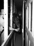 The Will Rogers Range Riders are traveling from West Texas to Austin, Texas. During a layover in Fort Worth, Texas, one of the Range Riders is checking on "Sammy" inside the horse car. Sammy is a bay-colored horse with a star patch on his forehead. While traveling in the train, Sammy learned how to pull the emergency cord and bring the train to a stop. The Range Rider is shown feeding Sammy hay.