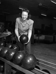 Louise Dodd is competing in the City Bowling Tournament. She entered the final game needing 165 pins to win and and dropped exactly that number. The victory gave Miss Dodd the tile of singles bowling queen. She is shown retrieving her bowling ball from the rack. Miss Dodd is dressed in a short-sleeve, button-up blouse and trousers.